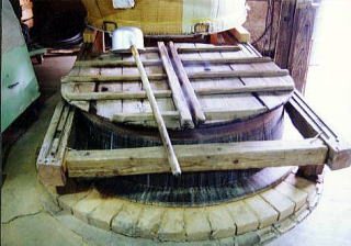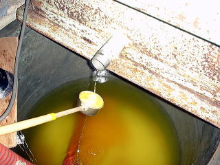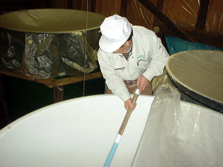 もろみは、酒母に麹と蒸し米と水を3回に分けて仕込みます。低い温度で約20日間かけてじっくりと醗酵させ、醗酵が終わるとアルコール分が約20度にもなります。3回に分けて仕込むので3段仕込みと言います。なぜこんな面倒なことをするのかといいますと、一度に大量に仕込むと酒母から乳酸の濃度が薄まりすぎて、もろみに侵入する雑菌の増殖を抑えることが出来なくなるからです。 ←仕込んだものを、木のかくはん棒で混ぜ、醗酵を助けます。 |
