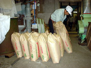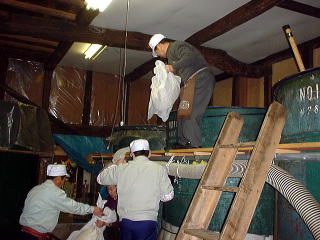 しぼられた原酒は一度タンクに入れて静かに寝かせます。その時底に沈むオリを取って少量のにごり酒として販売されます。出来上がった日本酒は変化しやすいので、活性炭を使ってろ過され、酵素の破壊と殺菌をかねて60度程度で加熱殺菌します。この過熱操作を「火入れ」と言います。生酒は火入れをしないで低温(マイナス5度位)で貯蔵して瓶詰して販売されます。香り豊かなお酒の出来上がりです。 |