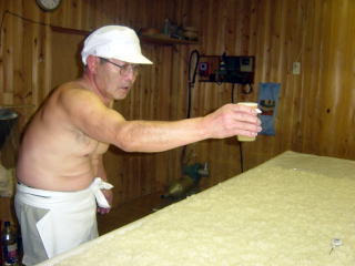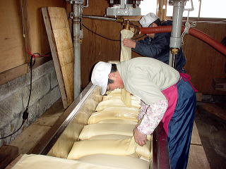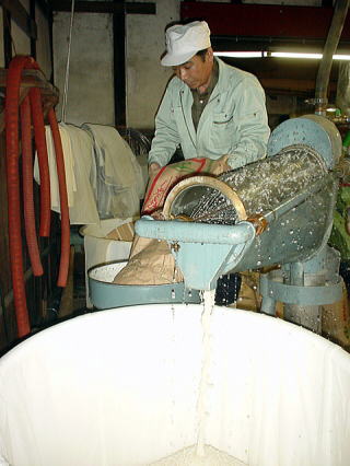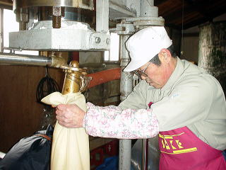 舟に入れたもろみは重石をかけて、ふなぐちからしたたり落ちます。これが原酒です。香り豊かなしぼりたての原酒を飲んだら、もうこたえられません。 原酒は約20度あり、 美味くて少し飲んだだけでも顔がほてってきます。 |