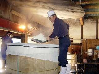 造り酒屋の朝は早朝から大賑わいです。 酒米を蒸すために大釜に火が入れられ、ぼうぼうと立ちのぼる湯気の中で仕事は始まります。ちょうどいい時間、水に浸したお米を、今度はこの大釜で蒸します。 ←酒米を蒸す大釜。直径2m以上ある、千と千尋の神隠しに出てきそうな巨大釜です。 ←大釜の上の甑(こしき)※から、蒸したお米をスコップで移してる様子。 ※一般家庭の蒸し器を思い浮かべて下さい。 蒸しあがったお米を麹室へ運び、麹菌が一番醗酵しやすい温度になるまで、手でほぐしながら、広げて冷まします。 |