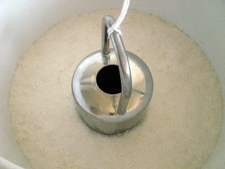 次は洗米。 専用の洗米機で、お米を洗います。 洗う水は、裏庭にある井戸水をろ過した、美味しくて安心な水。 洗米から、水にこだわってます。 洗った米を、水(仕込み水)に約10分間浸します。 |