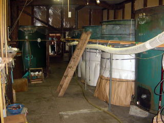 酒母とは、麹と蒸し米と水で酵母を培養したものです。蒸し米のでんぷんをブドウ糖に変え、それを分解してアルコールをつくることで、これがアルコール発酵です。この醗酵形式を並行複醗酵といい、日本酒もろみの最も重要な特徴です。酒母の中にあるステンレスの筒は温度を調節するためのものです。 温度が高すぎる時には、冷たい水を、低い時には、お湯を入れて、醗酵にちょうどいい温度を保たせます。 |